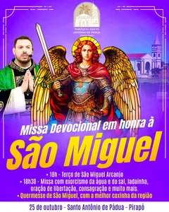 A Paróquia Santo Antônio de Pádua promove, neste sábado (25), a tradicional missa devocional em honra a São Miguel. A celebração religiosa acontece no distrito de Pirapó, em Apucarana (PR), e inicia às 18h, com um terço. Em seguida, será realizada a missa com exorcismo da água e do sal, ladainha, oração de libertação e consagração.