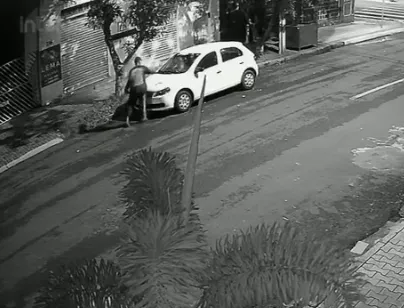 Na sequência, o homem joga outra pedra, mas o alarme do carro é acionado e ele vai embora seguindo pela Rua Osvaldo Cruz.
