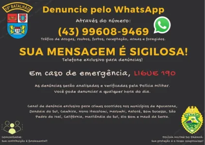 O número é o (43) 9 9608-9469, as informações serão recebidas com sigilo, informou a PM. O canal de denúncia é exclusivo para crimes ocorridos nos municípios de Apucarana, Jandaia do Sul, Cambira, Novo Itacolomi, Marumbi, Kaloré, Bom Sucesso, São Pedro do Ivaí, Califórnia, Marilândia do Sul, Rio Bom e Mauá da Serra.
