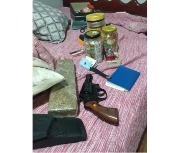 Durante buscas no quarto do filho, foram localizados em cima do guarda-roupas, oito porções de maconha, dois baseados e tabletes do entorpecente .Toda a droga pesou 735 gramas. Os policiais ainda encontram sete porções de cocaína, uma tesoura e um caderno contendo a contabilidade das vendas de drogas.