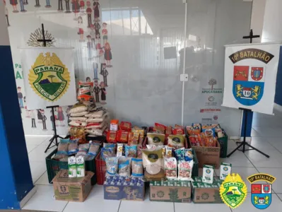 Policiais do 10º Batalhão da Polícia Militar (10º BPM) de Apucarana se mobilizaram para colaborar com a campanha 'Vacina Solidária', realizada pela prefeitura da cidade. A campanha visa arrecadar alimentos não perecíveis para doar às famílias carentes que são entregues no momento da vacinação contra a COVID-19.