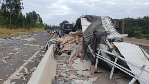 O acidente aconteceu na noite deste domingo (31), por volta das 22h20. Os Bombeiros, o Serviço de Atendimento Móvel de Urgência (Samu) e a Polícia Rodoviária Federal (PRF) atenderam a ocorrência. A carga de pisos de cerâmica ainda atingiu um carro. O motorista da carreta, de 43 anos, foi socorrido e levado pelo Samu até a Unidade de Pronto Atendimento (UPA). Ele sofreu um trauma na cabeça, mas considerado leve.