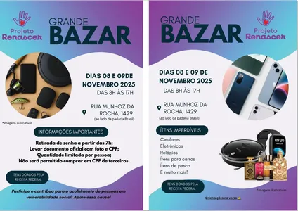 O Projeto Renascer, uma iniciativa dedicada ao acolhimento de dependentes químicos, pessoas em situação de rua e famílias em vulnerabilidade, está realizando o Grande Bazar, que começou neste sábado (8) e termina no domingo (9), em Apucarana.