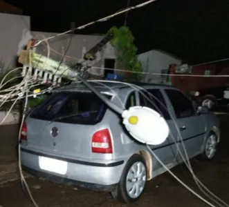 Com a queda de um dos padrões, atingiu um veículo que estava estacionado na frente da residência, causando danos consideráveis. Ninguém ficou ferido.