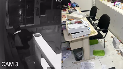 Ao verificar o interior da sala, os policiais encontraram o local completamente revirado, com gavetas abertas e objetos espalhados. Imagens do circuito de monitoramento, obtidas pela reportagem, mostram o suspeito dentro da unidade praticando o furto.