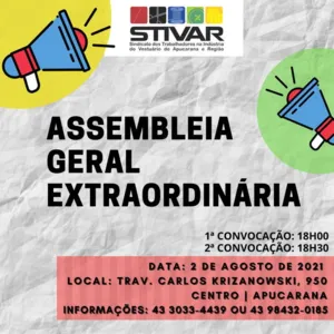 A Assembleia Geral do Stivar acontece nesta segunda-feira (02/08), com primeira convocação para as 18h00 e segunda convocação para as 18h30, independente do número de pessoas presentes.