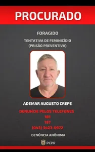 A Polícia Civil do Paraná (PCPR) divulgou, nesta quarta-feira (25), a imagem de um homem de 58 anos, identificado como Ademar Augusto Crepe, suspeito de ser o autor de uma tentativa de feminicídio ocorrida em Apucarana (PR). O objetivo é ampliar as buscas e também pedir ajuda da comunidade com informações que levem à captura do investigado, que está com a prisão preventiva decretada.
