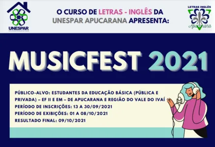 Seguem até 30 de setembro as inscrições para o MusicFest 2021, realizado pela Universidade Estadual do Paraná (Unespar), campus de Apucarana. O evento online do curso de Letras Inglês acontece entre os dias 1º e 8 de outubro e tem como objetivo promover a expressão artístico-cultural dos estudantes da Educação Básica, por meio da língua inglesa. As apresentações serão transmitidas pelo Instagram @ingles.letras e IGTV.