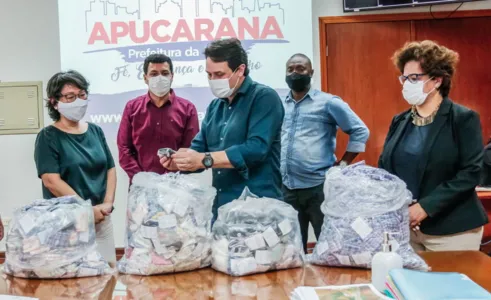 A prefeitura de Apucarana recebeu nesta quinta-feira (22) 2,5 mil máscaras de tecido da UTFPR, campus Apucarana, que foram confeccionadas por alunos e professores do curso de Design de Moda. O material foi entregue ao prefeito Junior da Femac, pelos professores Naomi Nagamatsu e Nélio Pinheiro, que desenvolveram o projeto junto dos estudantes.