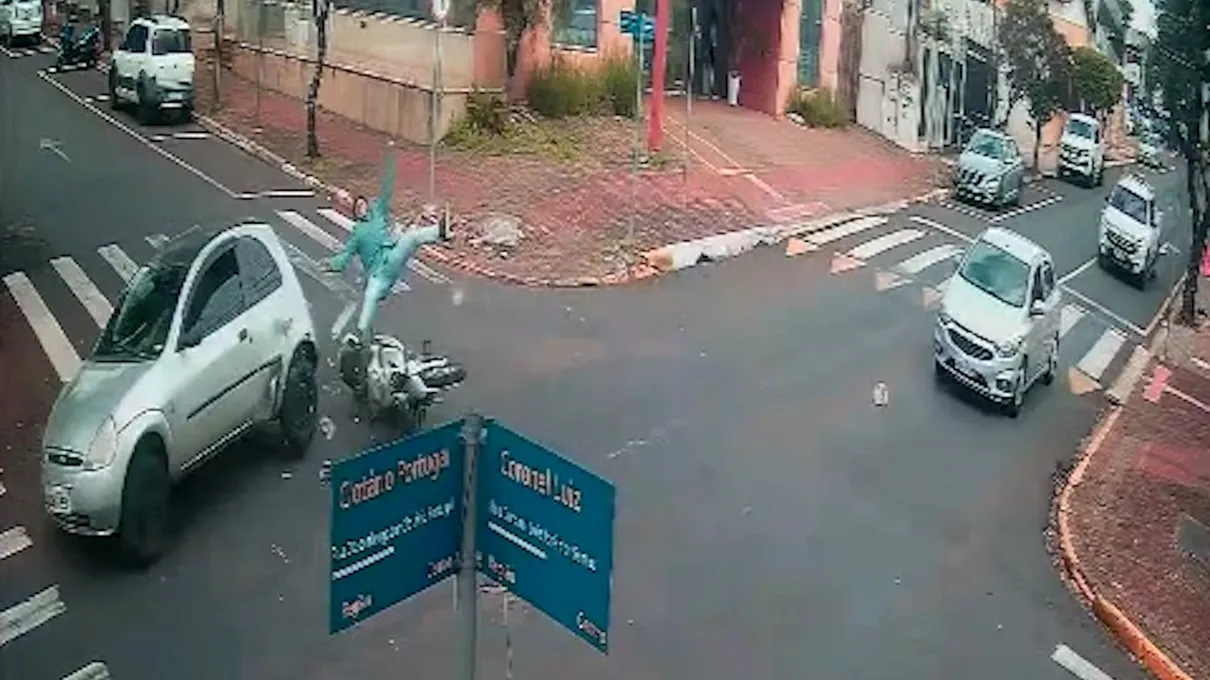 Imagens de câmeras de segurança mostram o momento exato da batida entre o Ford Ka e a Honda Biz resultando na colisão do carro contra o muro de uma empresa. A Polícia Militar esteve no local e registrou um boletim de ocorrência. Veja o vídeo: