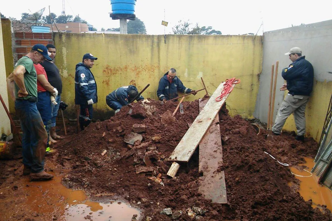Uma equipe do Corpo de Bombeiros trabalham para resgatar um pedreiro que ficou soterrado em um poço de aproximadamente três metros de profundidade, na manhã deste sábado (04/06) na Rua Mergulhão, no Jardim Lorena Lorena, em Arapongas.