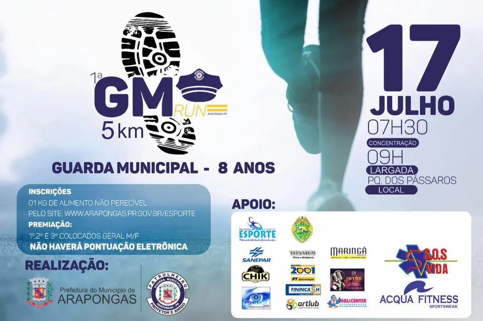 A Guarda Municipal (GM) de Arapongas através da Secretaria de Esportes realizará no dia 17 de julho uma corrida aberta ao público, para celebrar os oito anos da corporação na cidade.