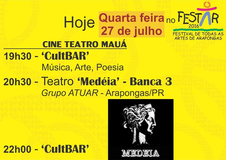 O palco será aberto às 19h30 para o CultBar, com apresentações de arte, música e poesia. Em seguida, à 20h30 é a vez do Teatro Medeia - Banca 3, encenado pelo grupo araponguense Atuar. E às 22h, o CulBar volta para movimentar o pública e encerrar a noite.