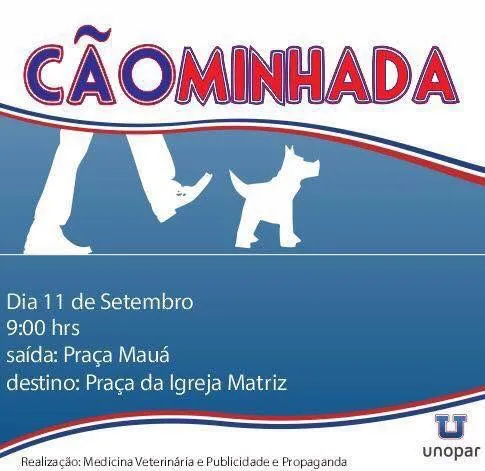 Alunos e professores dos cursos de Medicina Veterinária e Publicidade e Proapaganda da Universidade Norte do Paraná (Unopar) de Arapongas realizam neste domingo (11) a "Cãominhada", passeio ao ar livre, no centro da cidade, para os donos e seus animaizinhos.