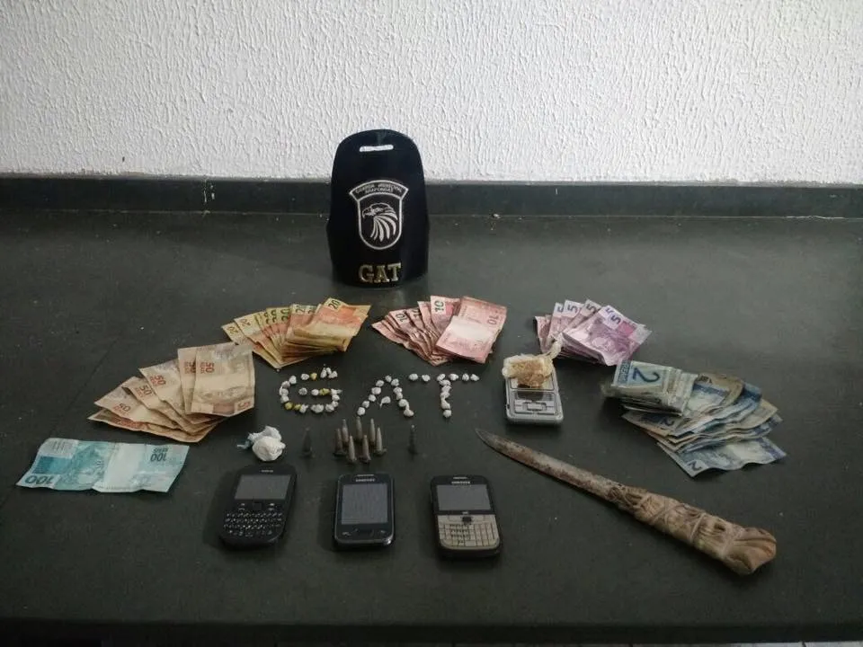 Já na casa, a GM realizou uma busca, onde encontrou sob posse de uma adolescente, duas pedras de crack e R$240 em dinheiro. Com a mulher, a equipe localizou ainda R$839 em cédulas, 40 pedras de crack, certa quantia em cocaína e três celulares.