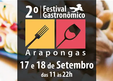 A segunda edição do Festival Gastronômico de Arapongas acontece neste sábado (17) e domingo (18), das 11h às 22h, na Praça da Igreja Matriz, na Avenida Arapongas. Com diversas opções de restaurantes, lazer e apresentações musicais, o evento promete superar o sucesso do ano passado.