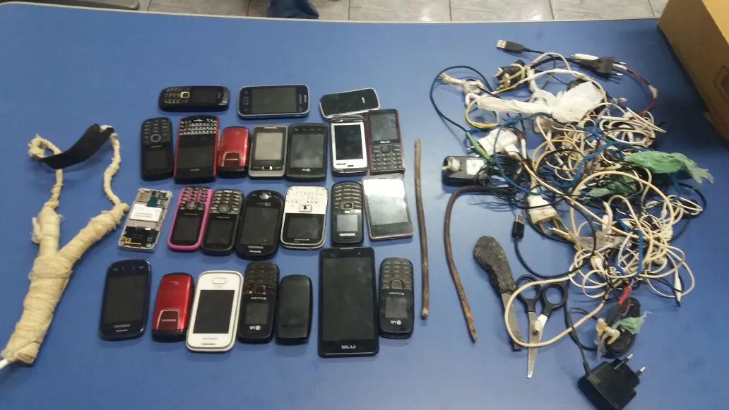 Além dos celulares, foram apreendidos no centro de carceragem carregadores, estoque (faca artesanal), tesoura, pedaços de ferro e até um estilingue.