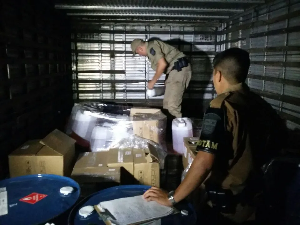 No caminhão havia diversos galões cheios de insumos que totalizou 2.063 litros e também 10 rolos de arama para cerca elétrica. A dupla recebeu voz de prisão e foi encaminhada à delegacia.