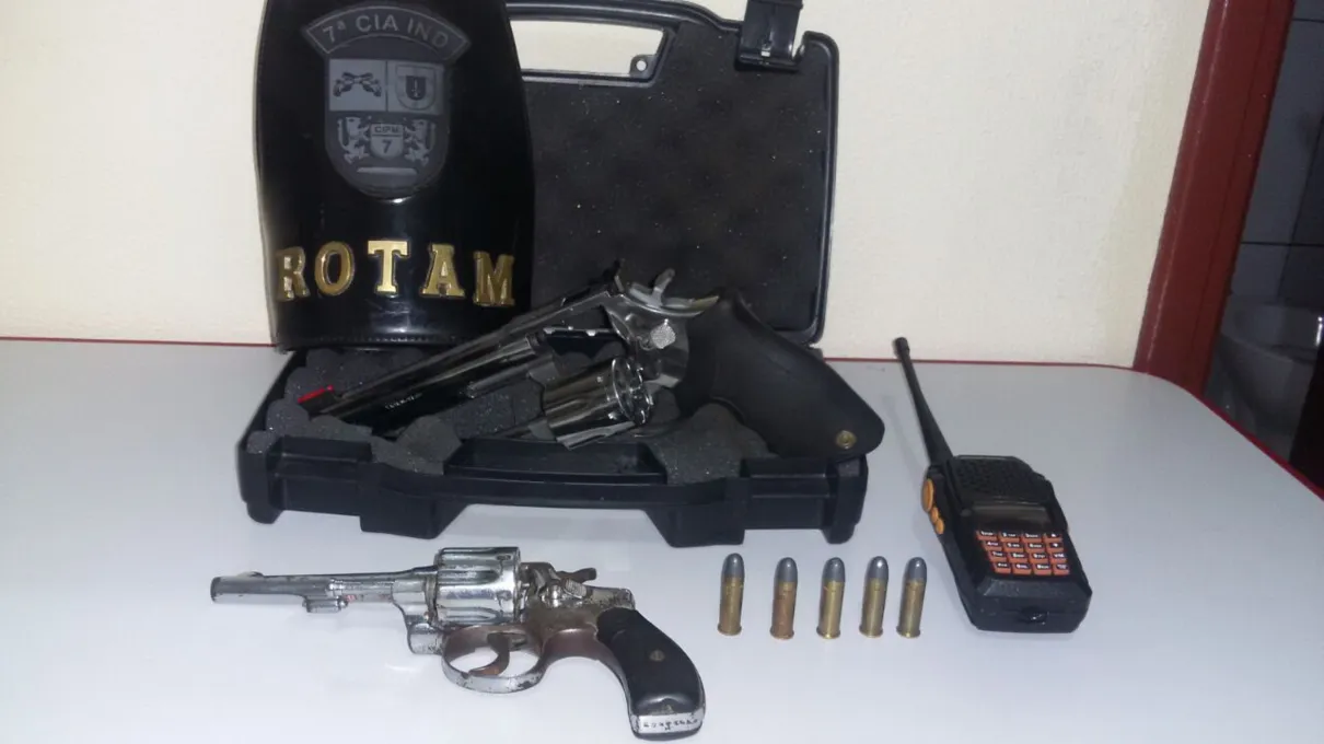 Com Emerson Cesar de Oliveira, 39 anos, foi encontrado um revólver calibre 32 sem munição. O homem estava acompanhado do filho, um adolescente de 15 anos, que alegou ter encontrado a arma em um matagal. A equipe fez buscas nos veículos que estavam estacionados em frente ao estabelecimento e encontrou munições de calibre 38 intactas no carro de outro homem identificado como Robson da Silva do Amaral, 35 anos. Na casa de Amaral, os policiais encontraram um revólver calibre 357 sem munição e um rádio HT na frequência da transmissão da PM.