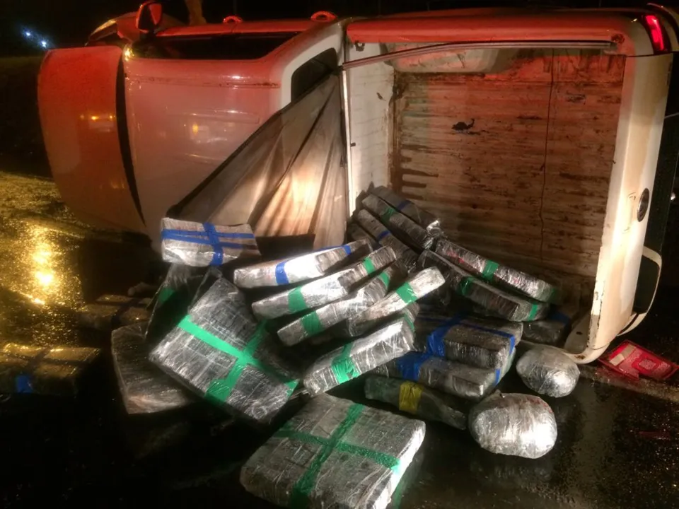 Segundo a PRE, uma equipe foi solicitada para atender um capotamento. No local foi encontrada uma VW Amarok, placas de Maringá - sem indicativo de roubo - tombada na rodovia e com a caçamba lotada de maconha.