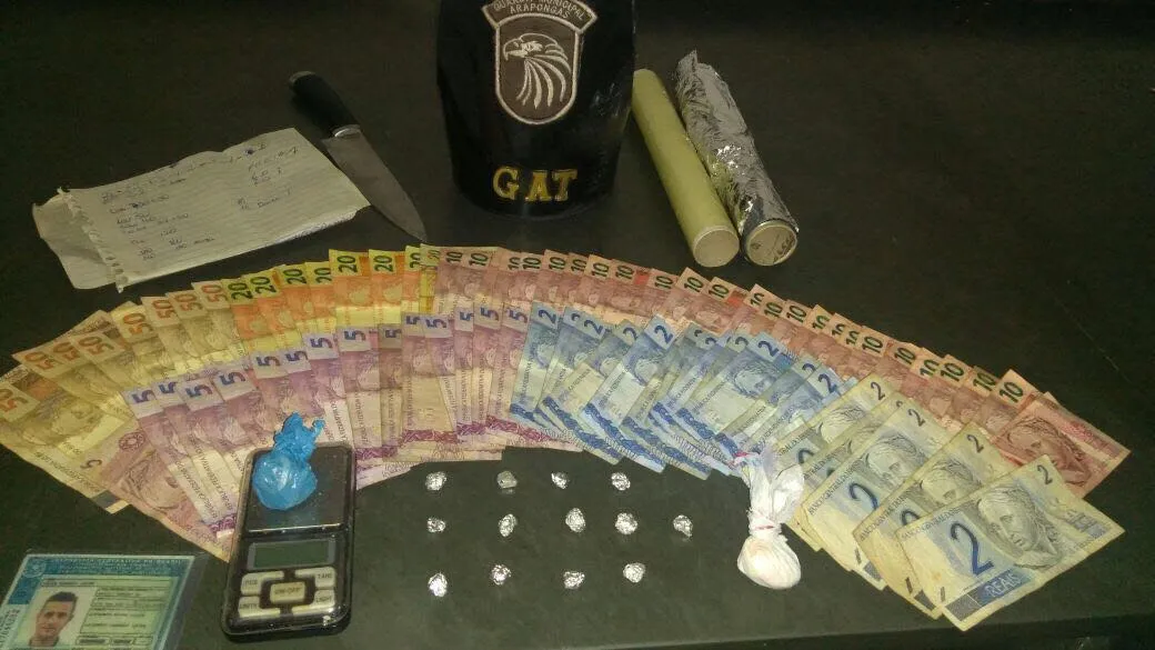 No local foram encontrados 13 pedras de crack prontas para venda e uma pedra in natura grande. Também foi apreendido uma porção de maconha, quase mil reais em dinheiro trocado, uma balança de precisão e outros materiais para embalar e fracionar os entorpecentes.