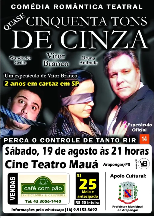 A peça teatral dirigida pelo ator Vitor Branco, de São Paulo, será realizada no Cine Teatro Mauá, às 21h.Vitor Branco é conhecido das novelas “Barriga de Aluguel”, “ O Clone” e a Praça é Nossa. E traz para Arapongas o espetáculo inspirado no best seller” Cinquenta tons de Cinza”.Os convites podem ser adquiridos na panificadora café com pão. Para maiores informações ligar: 3056-1440.