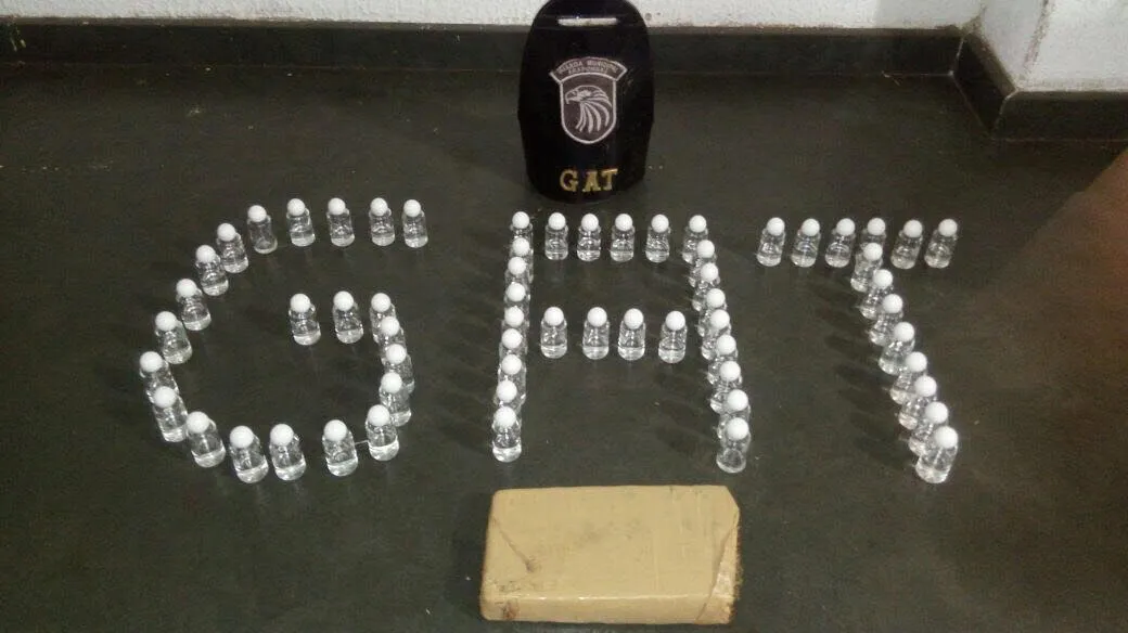 Ele acabou contido e o material descartado por ele recuperado. Na embalagem foram encontrados os frascos e o tablete de maconha. O menor revelou que a droga seria para uso pessoal.