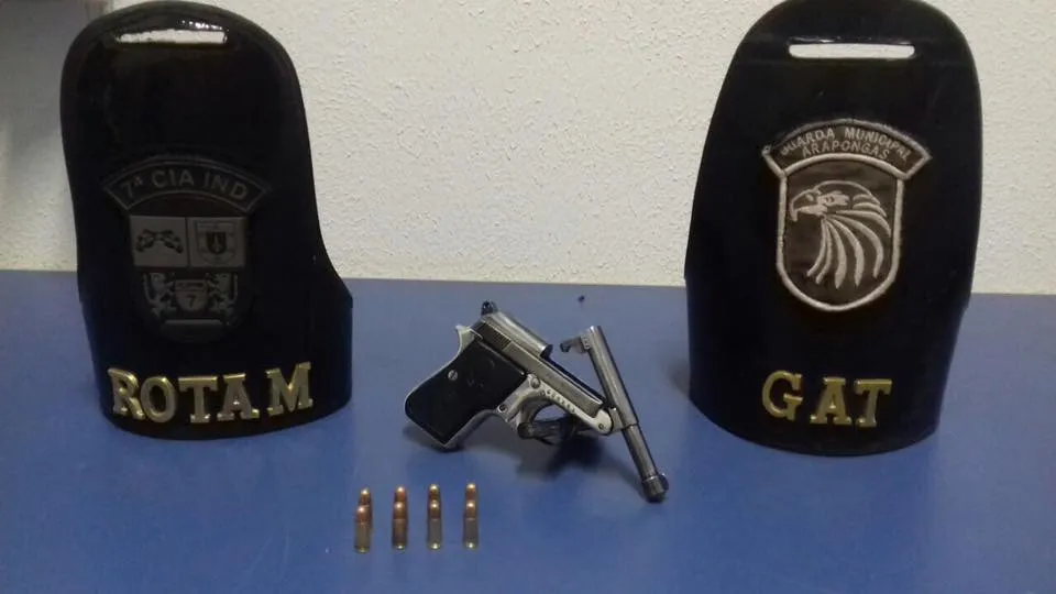 Em buscas no quintal foi localizada uma motoneta escondida no fundo da garagem, de propriedade da moradora da residência, sendo a mesma que os autores utilizaram no crime, e também uma pistola Bereta calibre 6.35, com oito cartuchos intactos.