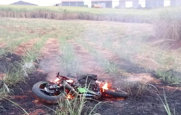 A motocicleta acabou pegando fogo após a colisão sendo necessário o uso de um caminhão pipa para apagar as chamas que estavam se espalhando pela vegetação.