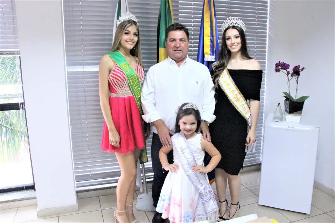 No início desta semana, o prefeito de Arapongas Sergio Onofre, recebeu a visita de três araponguenses, que participaram recentemente de Concursos de Beleza, entre eles, o Miss Arapongas 2017.Isabela Stella(22), Miss Arapongas 2017, Isabelle Queiroz(18), Miss Teenager Brasil e Yara Liz Palácio Torres(5), Miss Infantil 2017, conheceram o gabinete, além dos demais espaços do Paço Municipal.