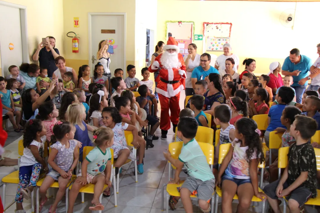 Cerca de 80 alunos do CMEI escreveram cartinhas e foram contemplados com presentes, em evento que contou com a presença da juíza Renata Maria Sassi, do secretário de Educação Paulo Valério e do gerente da agência dos Correios de Arapongas, Jurandir Duarte.