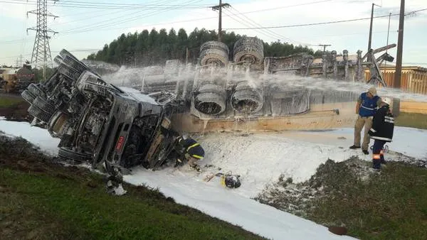 Uma carreta carregada com combustível (45 mil litros de etanol) tombou no início da noite desta quinta-feira (14) no Distrito de Aricanduva, em Arapongas. O material inflamável - etanol - vazou na pista. O condutor ficou preso nas ferragens por cerca de 40 minutos até ser resgatado pelo Corpo de Bombeiros.