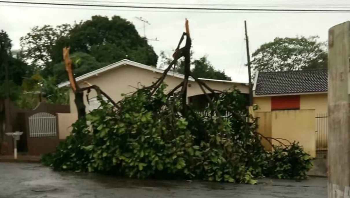 A chuva intensa registrada em Arapongas, no norte do Paraná, no domingo (11), derrubou árvores e alagou ruas. Ninguém ficou ferido.