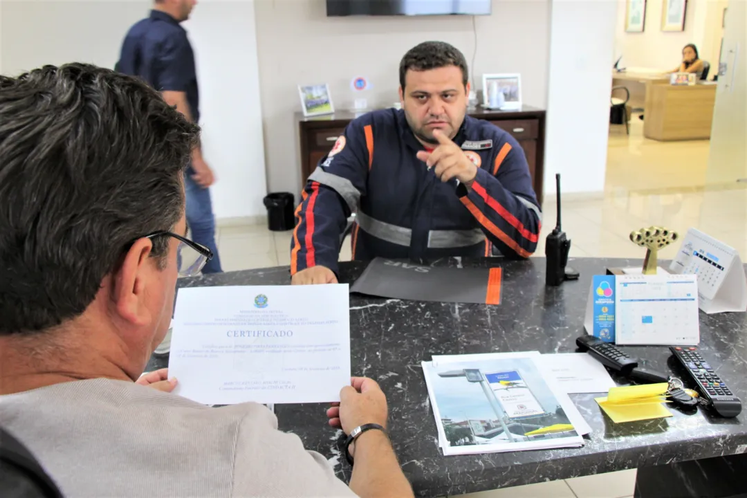 Na oportunidade, o socorrista Rogéreio Fernandes apresentou ao prefeito o certificado de conclusão do curso que foi emitido pelo ministério da defesa através do CINDACTA II em Curitiba.