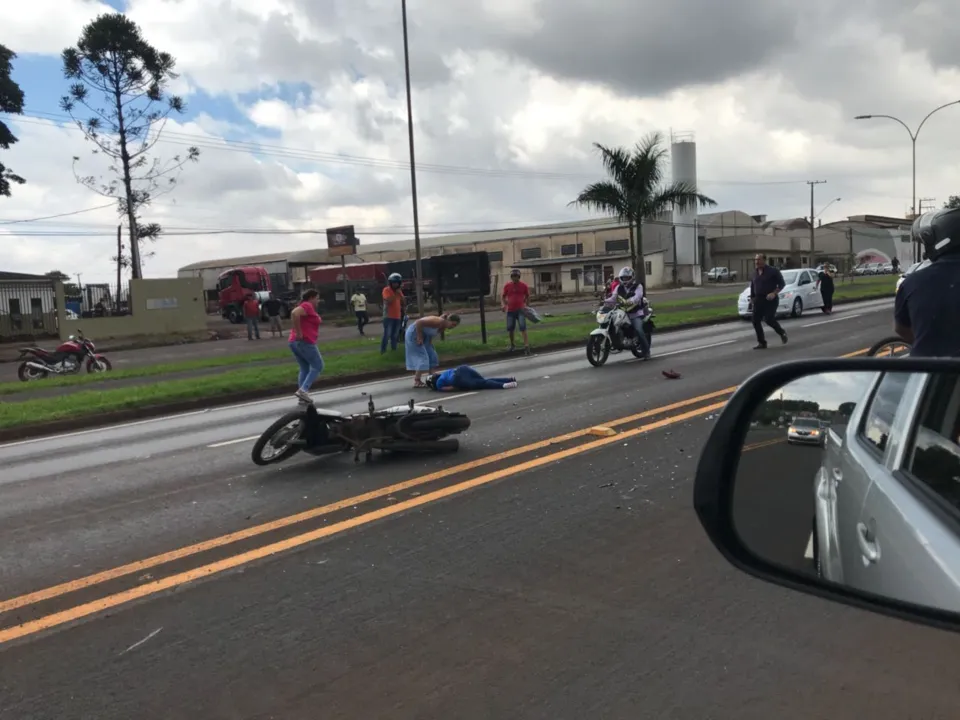Testemunhas informaram que a colisão envolveu duas motos e ocorreu por volta das 11h50 em frente a empresa Aramóveis.