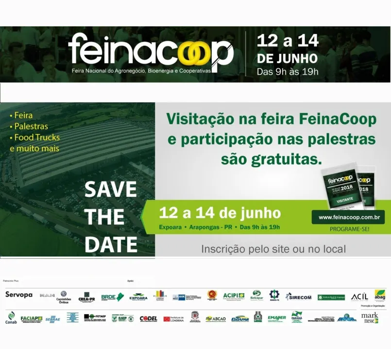 Arapongas recebe nos dias 12, 13 e 14 de junho a Feira Nacional do Agronegócio, Bioenergia e Cooperativas (Feinacoop), no Centro de Eventos Expoara.