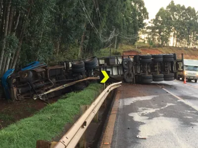 Carreta carregada com frango tomba na PR-444 em Arapongas
