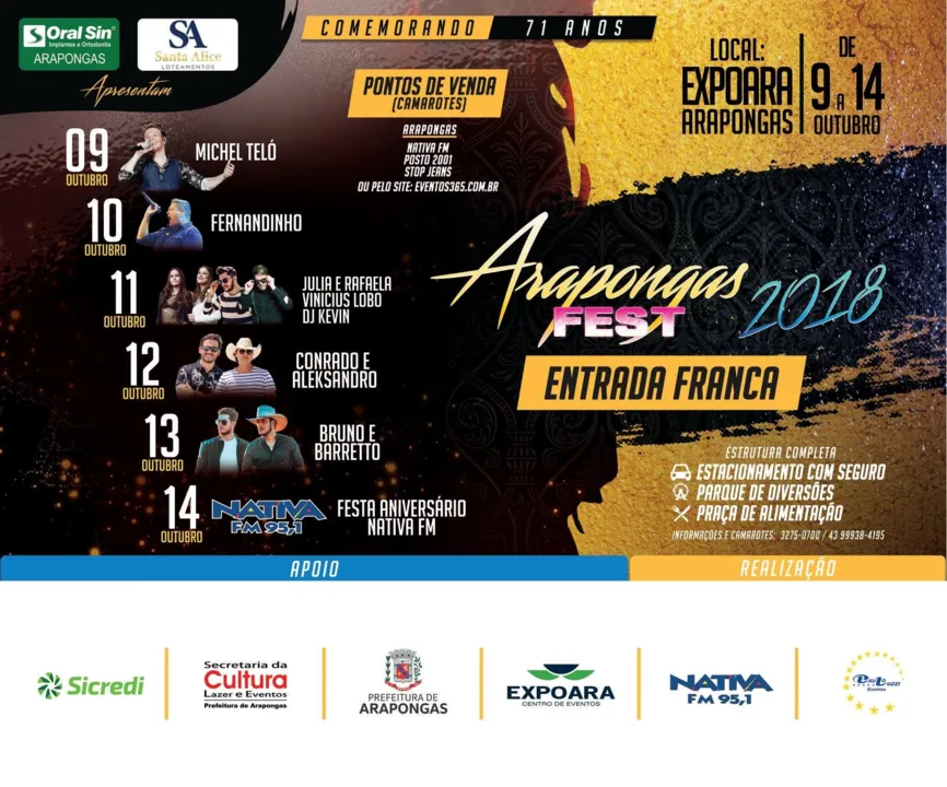 Em comemoração aos 71 anos de Arapongas acontece de 9 a 14 de outubro o Arapongas Fest 2018, uma parceira entre a Prefeitura Municipal de Arapongas, através da Secretaria de Cultura, Lazer e Eventos, Nativa FM e Paulo Luzzi Produções.