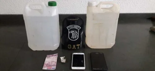 Com o rapaz que estava conduzindo a moto a GM encontrou uma porção de maconha. A equipe então decidiu verificar a casa dos suspeitos e encontrou dois galões com um total de 10 litros com o entorpecente preparado clandestinamente baseado em clorofórmio e éter.