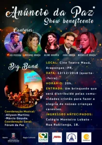 Com o apoio da Prefeitura Municipal de Arapongas acontece no próximo dia 12 de dezembro, às 20h00, no Cine Teatro Mauá, o Show beneficente “Anúncio da Paz”, com a coordenação musical de Allyson Martins e Márcio Gouvêa e coordenação geral do Fórum da Paz.