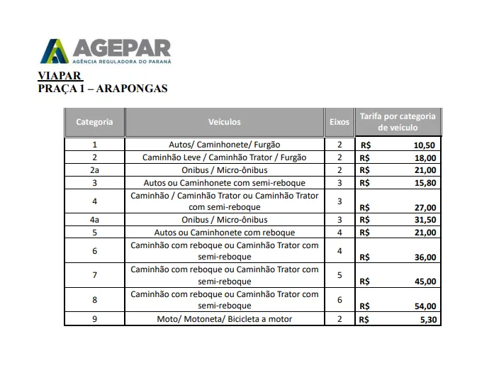 O maior será concedido a Viapar, 17,60%, que resulta, além do reajuste anual de 7.79%, de um acréscimo oriundo do degrau tarifário aprovado em janeiro deste ano e não aplicado. Diferente dos outros anos, a Agepar, além de homologar as novas tarifas decidiu apresentar também os valores finais que serão aplicadas em todas as praças de pedágio. Os novos preços passam a valer a partir da publicação específica do DER.