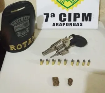 sofá um revólver calibre 32, novem munições, além de uma porção de maconha.