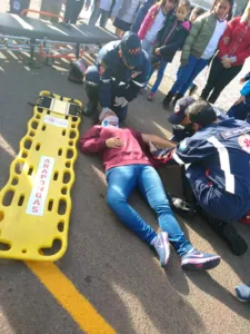 Alunos participam de uma simulação de acidente