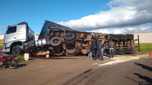 Uma carreta tombou na tarde desta sexta-feira (24) em Arapongas, no Conjunto Interlagos, na rotatória da Avenida Tico-tico do Campo, próximo à esquina com a Rua Taperaçu Cinza.