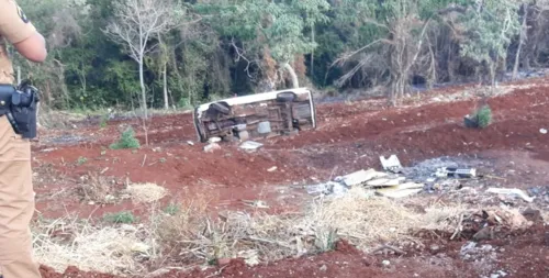 Um carro capotou e caiu em um barranco, na tarde deste domingo (11), na Rua alma de Gato, no Conjunto Araucária, em Arapongas.