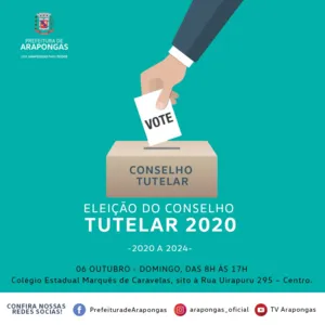 A Secretaria Assistência Social e Conselho Municipal dos Direitos da Criança e do Adolescente (CMDCA) reforçam que neste domingo (06 de outubro) acontece a Eleição do Conselho Tutelar de Arapongas. A votação acontece das 8h às 17h, no Colégio Estadual Marquês de Caravelas, situado na Rua Uirapuru, 295 – Centro.