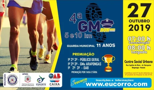 Com o apoio da Prefeitura de Arapongas, através da Secretaria de Esporte e OAB-Subseção Arapongas, a Guarda Municipal de Arapongas (GMA) realiza no dia 27 de outubro a 4ª GM Run – evento esportivo de corrida e caminhada. A ação marca as comemorações dos 11 anos da GMA. A edição contará com percursos de 5 km e 10 km, com ponto de partida no Centro Social Urbano (CSU), às 8h00. É solicitado aos atletas participantes que contribuam com a doação de 1 kg de alimento ou material de limpeza. As doações devem ser entregues no dia do evento, no local da largada.