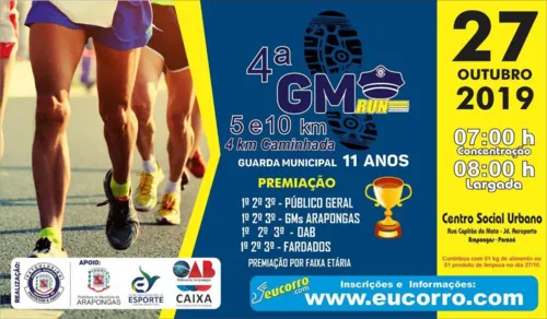 Com o apoio da Prefeitura de Arapongas, através da Secretaria de Esporte e OAB-Subseção Arapongas, a Guarda Municipal de Arapongas (GMA) realiza no dia 27 de outubro a 4ª GM Run – evento esportivo de corrida e caminhada. A ação marca as comemorações dos 11 anos da GMA. A edição contará com percursos de 5 km e 10 km, com ponto de partida no Centro Social Urbano (CSU), às 8h00. É solicitado aos atletas participantes que contribuam com a doação de 1 kg de alimento ou material de limpeza. As doações devem ser entregues no dia do evento, no local da largada.