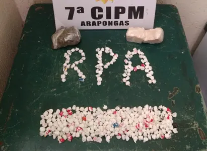 A Polícia Militar de Arapongas apreendeu cocaína, maconha e crack durante uma ocorrência nesta sexta-feira (25), na Vila Araponguinha. Mais de 300 porções de cocaína foram apreendidas na ocorrência.