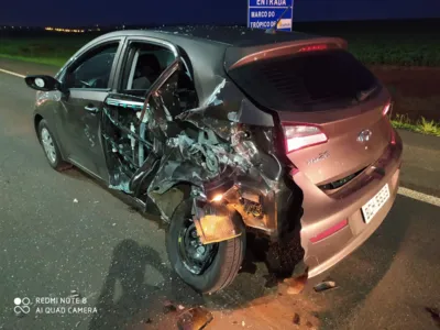 Com o colisão, o HB 20 sofreu danos consideráveis. No carro estava o condutor de 45 anos, ele não sofreu ferimentos. O motorista do caminhão, de 44 anos também não se machucou.